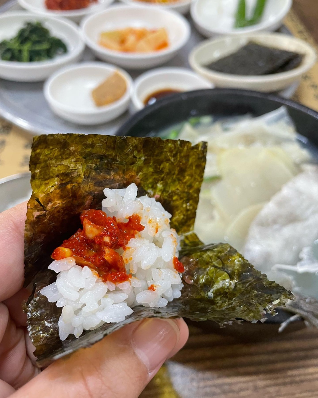 이 집의 백미는 양파를 다져 넣은 멍게 젓갈인데, 마른김에 밥을 넣고 이 멍게 젓갈을 올려 먹으면 된다. 젓갈의 짭조름하고 매콤한 풍미와 대구탕 국물이 완벽하게 어우러진다. 식초를 소량 넣어 감칠맛을 올리는 것이 단골의 팁이다.