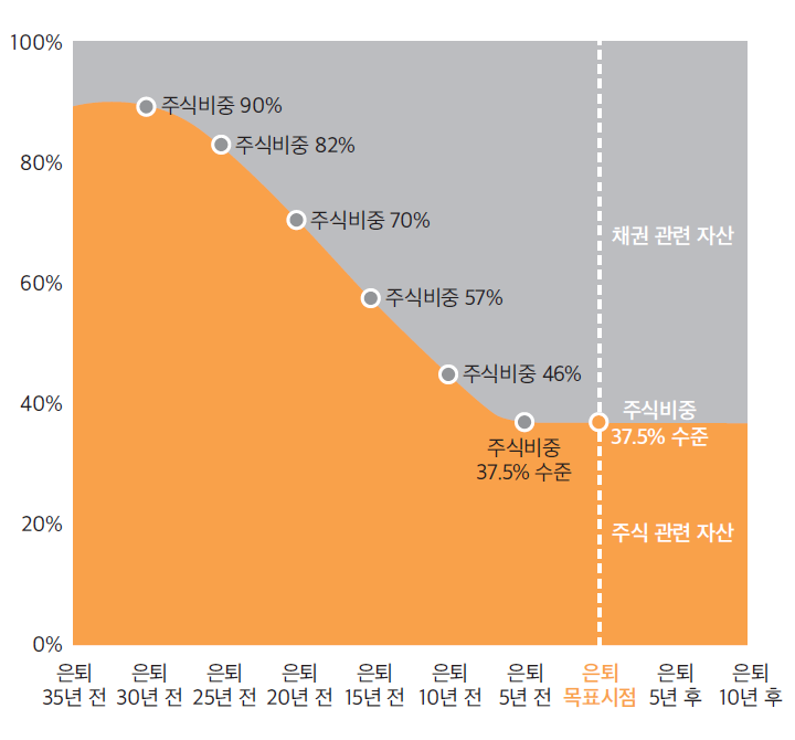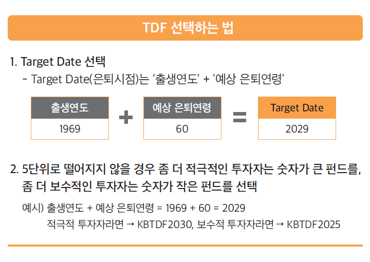 퇴직연금 계좌를 지속해서 관리하는 게 어렵다면 은퇴 시점에 맞춰 포트폴리오를 조정해주는 ‘TDF’가 좋은 대안입니다. 보통 TDF 상품명 뒤에 숫자가 붙는데 이는 은퇴 시점을 뜻합니다. 예를 들어 ‘KB 온국민 TDF 2035’라는 상품은 2035년에 은퇴하는 직장인을 모델로 운용하는 식이죠. 적극적인 투자를 원한다면 퇴직 시점보다 숫자가 큰 펀드를 좀 더 보수적인 투자자는 숫자가 작은 펀드를 선택하면 됩니다.