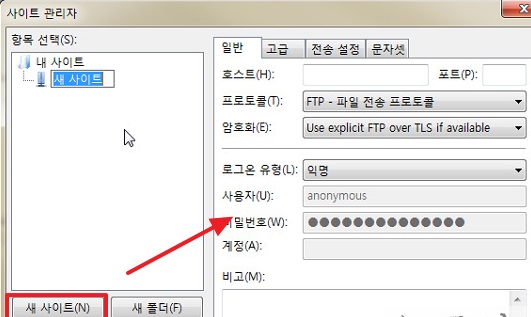 ▼ [사이트 관리자] 대화상자에서 계정을 추가할려면 [새 사이트] 버튼을 클릭합니다.