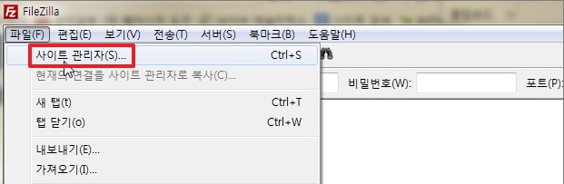 ▼ 계정을 추가하기 위해서 파일 메뉴의 [사이트 관리자]를 클릭합니다. 그럼 계정 관리가 가능한 팝업창이 뜨게 됩니다.