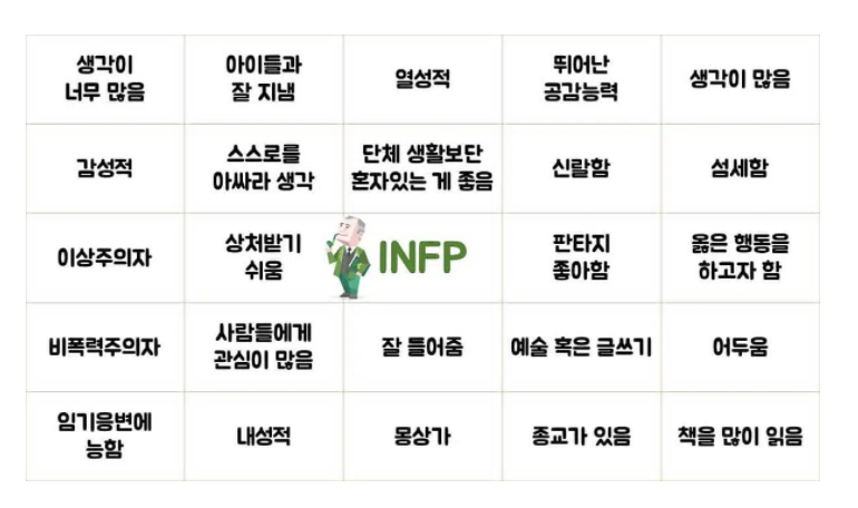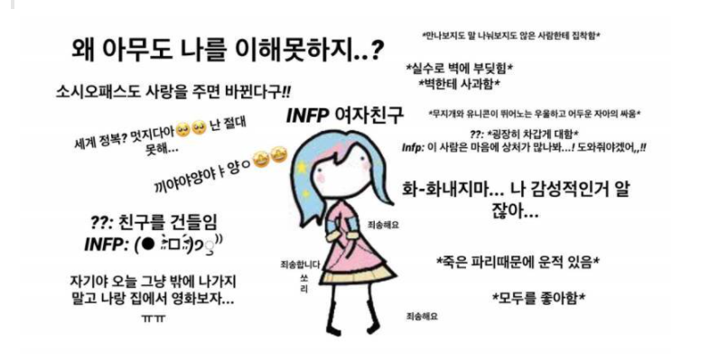 MBTI 성격유형 중 INFP 유형의 특징 및 연애, 궁합, 성격, 팩폭 등에 대해 알아보겠습니다.