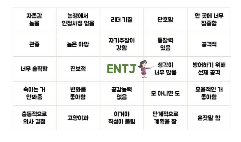 MBTI 성격유형 중 ENTJ 유형의 특징 및 연애, 궁합 등에 대해 알아보겠습니다.