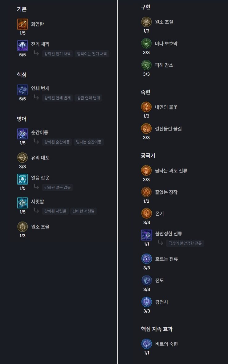다만, 충분한 육성과 세팅이 진행되지 않은 상태에서는 다소 위험 부담이 있는 빌드이기도 하다. 기본 공격이 근접 형태라는 점, 그리고 연쇄 번개의 마나 소모량이 상당하기에 딜로스가 자주 발생할 수도 있다.