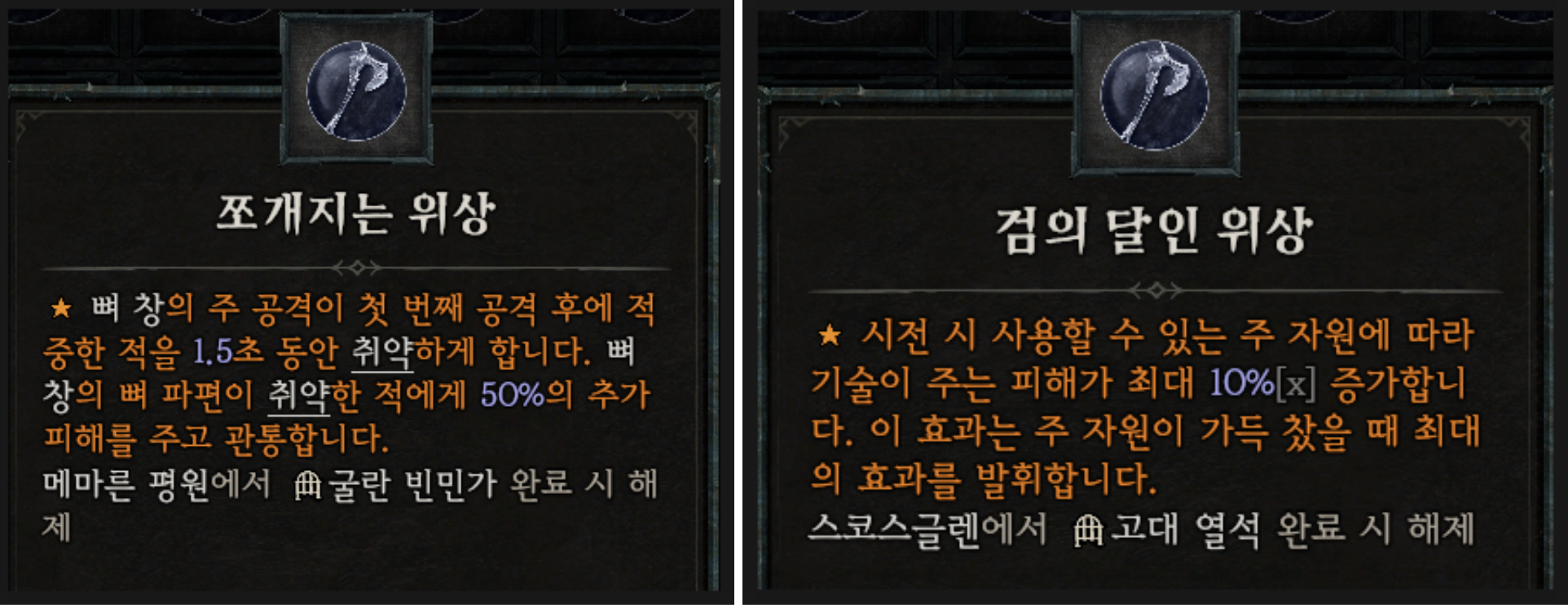 전설의 위상은 위에보시는 2개의 위상을 추천드립니다. 특히, [뼈 창]에 특화되어 있는 [쪼개지는 위상]은 적을 취약하게 만들며 취약 상태의 악마에게 추가피해와 관통효과를 부여합니다.