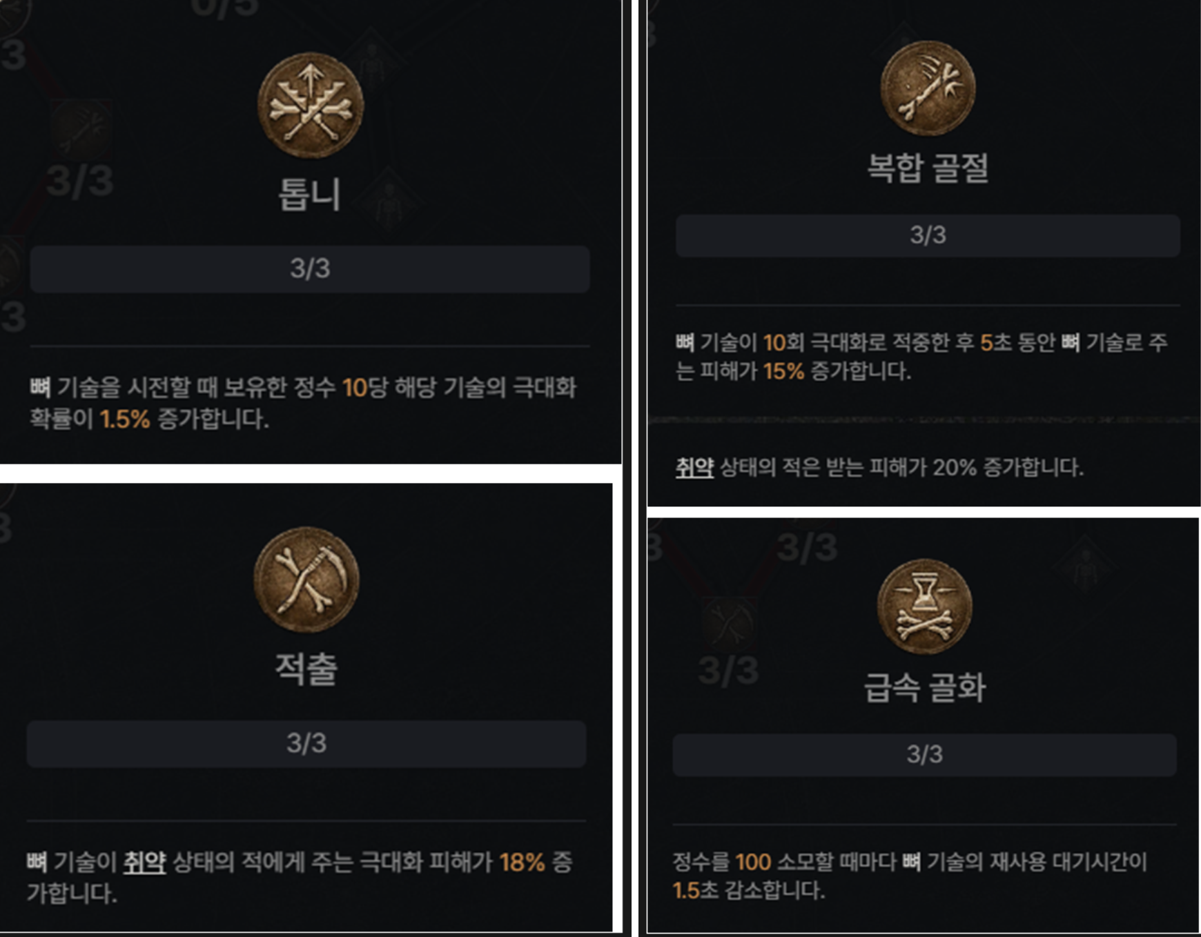 사냥 피로도를 낮춰주는 [뼈 감옥] 스킬과 [강화된 뼈 감옥], [섬뜩한 뼈 감옥] 까지 찍어서 정수 확보와, 취약 디버프를 걸도록 합시다.