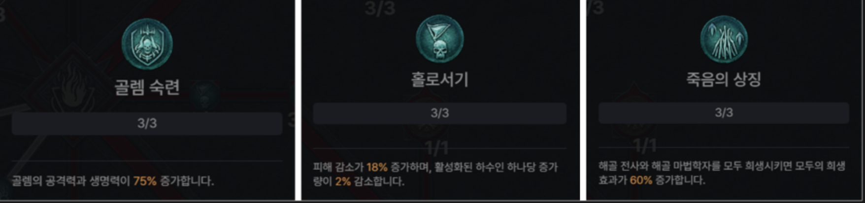 [골렘 숙련], [홀로 서기], [죽음의 상징]을 다 3포인트씩 찍어주시고 마지막으로 [골화 정수]를 찍음으로써 스킬트리를 완성하시면 됩니다.