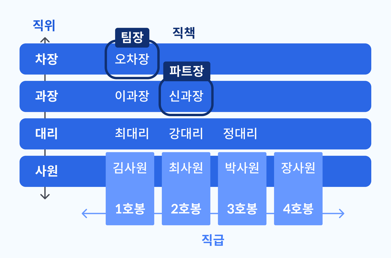 흔히 호봉(연차)으로 표현할 수 있는데요. 직급은 조직 내에서 승진, 보상 등에 영향을 미치며, 높은 직급에 따라 더 큰 책임과 권한을 맡게 됩니다.