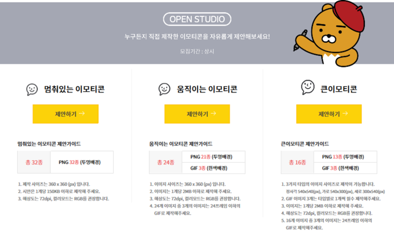제작한 이모티콘 제안은 카카오 이모티콘 스튜디오에서 가능합니다. 이 사이트에서는 제작 전 크리에이터들이 지켜야 할 제안 가이드가 자세하게 적혀 있는데요.