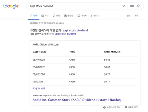 배당락일은 구글링으로 간단하게 확인할 수 있습니다. 구글 검색창에 해당 기업의 티커(ticker)*와 “stock dividend”를 검색하면 쉽게 알 수 있어요. 좀 더 확실하게 확인하는 방법도 있습니다. 해당 주식이 거래되는 시장에서도 확인할 수 있어요.