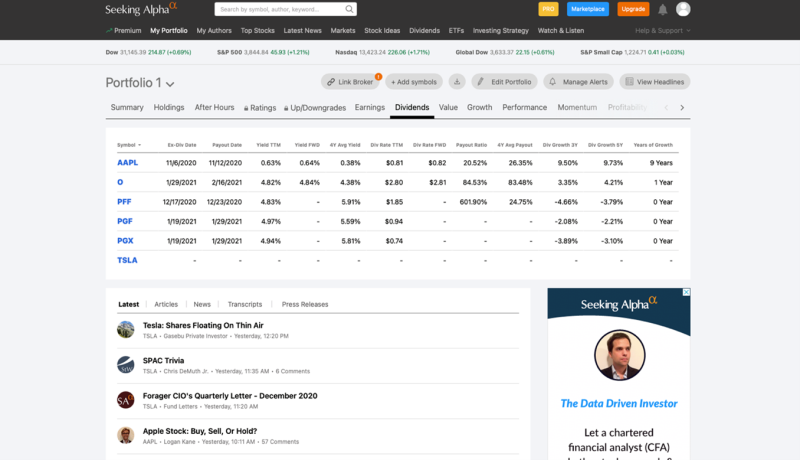 많은 해외투자자가 이용하는 사이트입니다. 사이트 내에 배당주 파트가 따로 있어요. 투자하는 배당주와 관련된 뉴스도 볼 수 있고, 애널리스트들의 배당주 분석 및 투자전략을 볼 수 있습니다. 회원가입을 하면 내 포트폴리오를 만들어서 관리할 수도 있어요. 또한 Seeking Alpha는 안드로이드, ios 기반 모바일 애플리케이션으로도 이용 가능하니 참고하면 좋겠습니다.