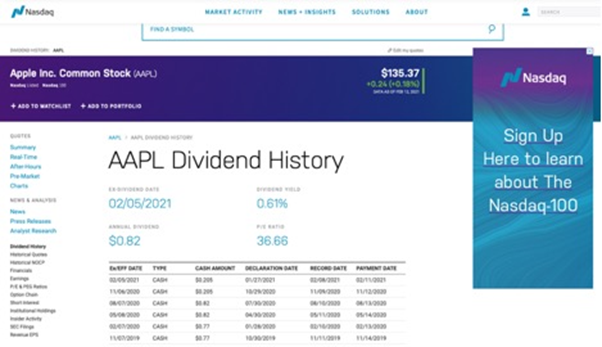 예를 들어 애플 주식은 나스닥 시장에서 거래되는데요, 나스닥 홈페이지에서 애플 주식(AAPL)을 검색하면 해당 회사의 정보를 열람할 수 있습니다. 여기서 “Dividend History” 창으로 이동하면 배당락일을 비롯해 배당과 관련된 정보들을 볼 수 있으니 참고하시기 바랍니다.