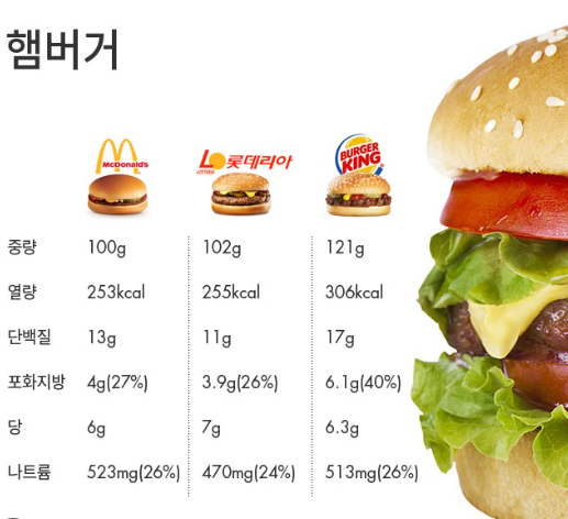 햄버거의 경우 빅맥은 590kcal, 일반 햄버거는 280kcal이며 영양분석을 할 때 다른 음식에 비해서 열량이나 영양소의 균형상태가 나쁘지 않다. 따라서 햄버거를 먹으면 비만을 초래한다는 것은 사실과 다르다 하겠다.
