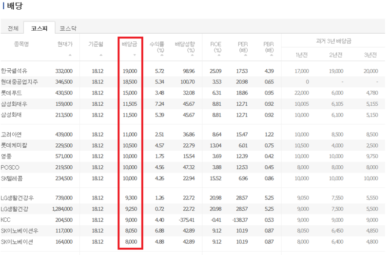 배당주를 찾는 기준으로 주당 배당금과 배당수익률이 주로 사용되는데요. 주당 배당금은 한 주에 배당된 금액을 의미합니다. 아래 사진은 포털사이트에서 코스피에 상장된 주식 중 배당금이 많은 종목을 검색한 결과입니다. 주당 배당금이 많은 주식을 다량으로 보유하고 있다면 많은 배당금을 기대할 수 있는데요. 이 금액은 최근 결산연도를 기준으로 하고 있기 때문에 주식을 매수하기 전에 과거 몇 년간의 배당금액도 함께 고려해봐야 합니다.