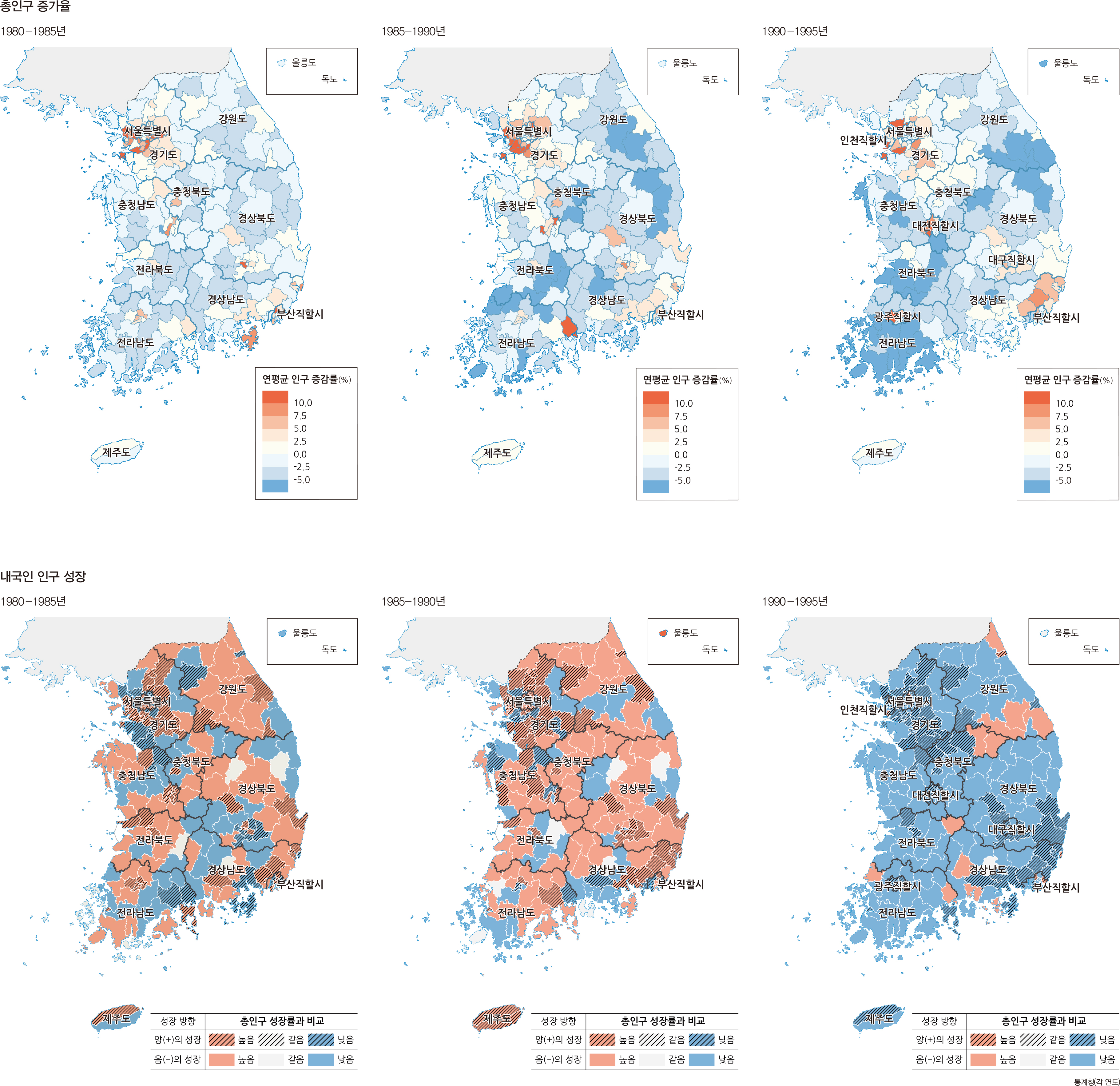 같은 시기 충청권과 강원권 총인구의 연평균 성장률은 증가하였으나, 다른 권역에서는 이와 반대의 인구 성장이 나타났다. 내국인만을 대상으로 살펴보면 1980-2005년 사이 총인구의 변화율과 비슷한 수준이었으나, 2005-2010년 사이에는 내국인의 변화율이 총인구보다 더 큰 수준이었다.