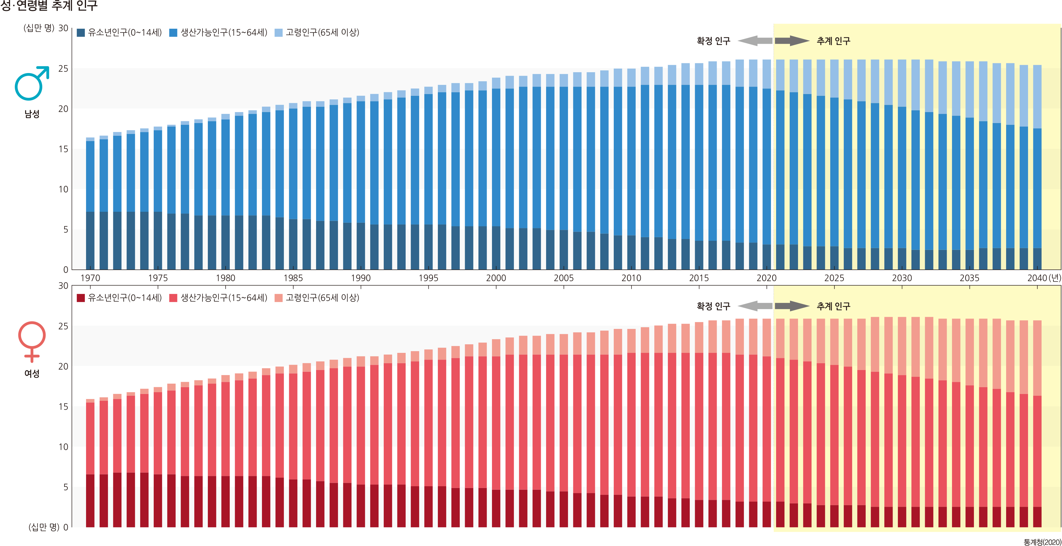 인구의 감소와 함께 우리나라 중위연령도 증가할 것으로 예상되는데, 2020년과 비교할 때 2040년의 전체 인구의 중위연령은 약 10세 증가한 54세로 전망된다. 여성의 중위연령(56세)이 남성보다(53세) 높을 것으로 추정되는데, 이는 남성보다 여성의 기대 수명이 더 길어질 것으로 해석할 수 있다.