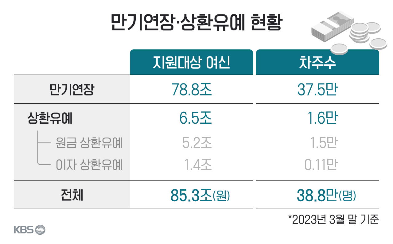 전체 지원 대출 잔액 중 92%(3월 말 기준 78.8조 원)가 '만기연장'이다. 원래 예고했던 것처럼 2025년 9월까지 이용 가능하다.