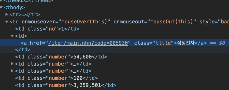 먼저 종목명은 table 안에 두 번째 셀에 a태그 안에 들어있네요.