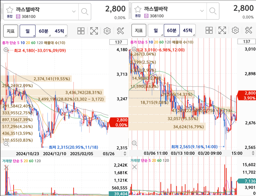 까스텔바작도 작년 12월 계엄 선포 직후 이재명 관련주들이 연상을 갈 때 잠깐 올랐던 적이 있지만 다른 테마주들에 비해 거래량이나 상승폭이 아쉬웠다.
