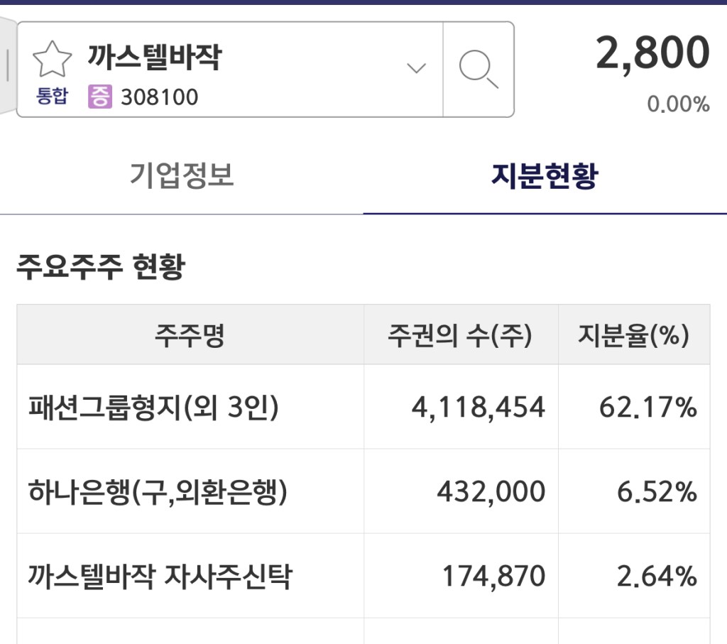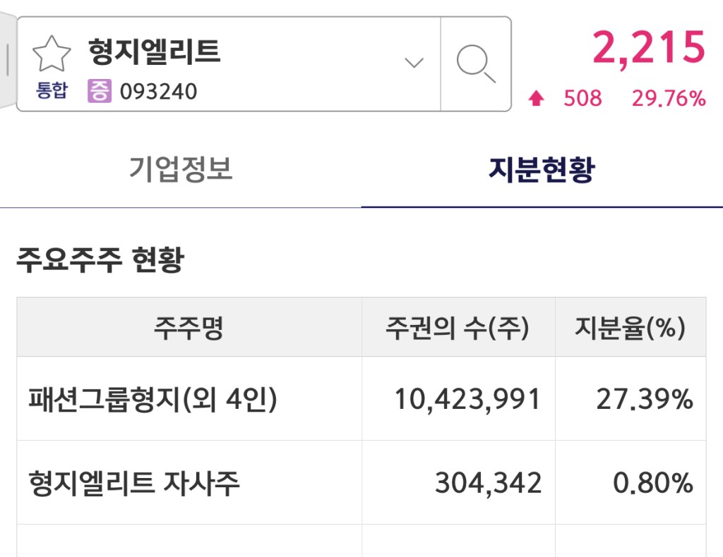 기업의 지분 현황을 살펴보니 최대주주가 패션그룹형지 이다.