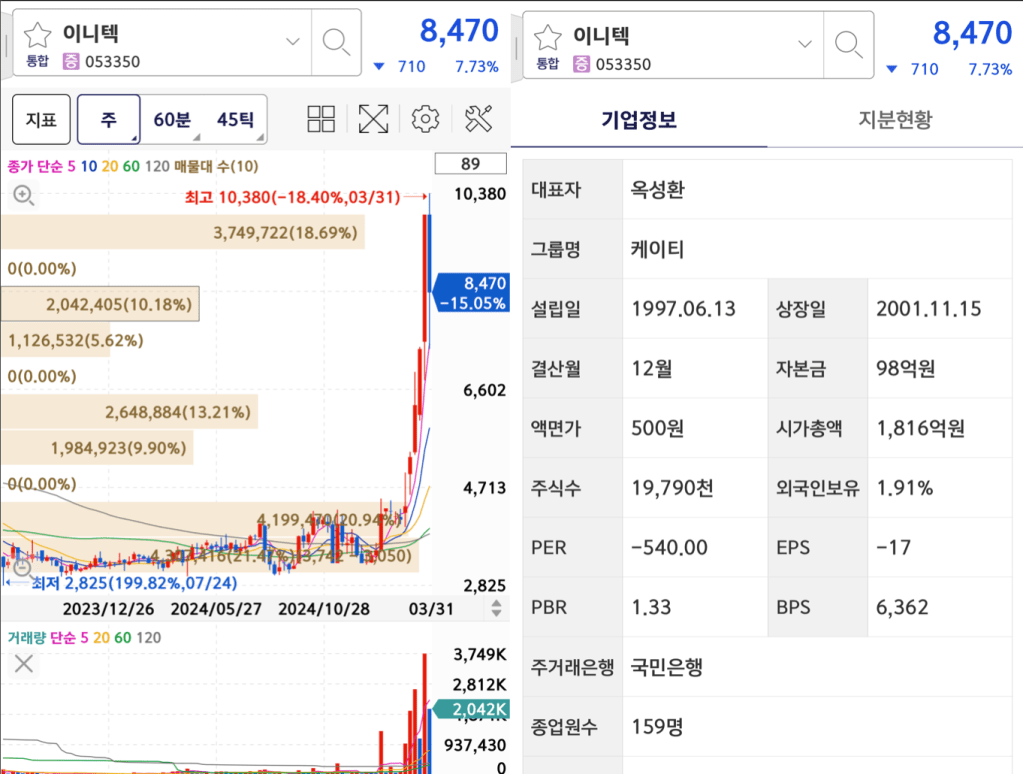 이니텍은 원래 작년까지 KT 의 자회사였는데 경영상의 이유로 엔켐과 중앙첨단소재에 매각 예정이라고 한다.