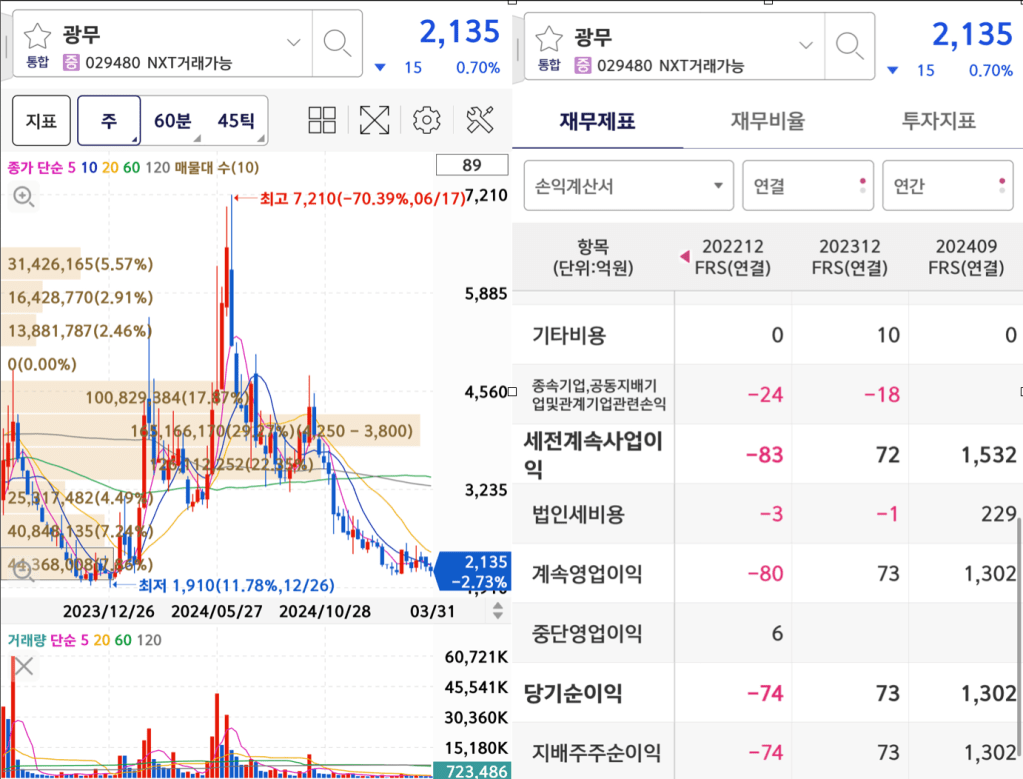 광무는 차트상 바닥이고 특이사항으로는 지난해 3분기 세전계속사업이익 금액이 크다.