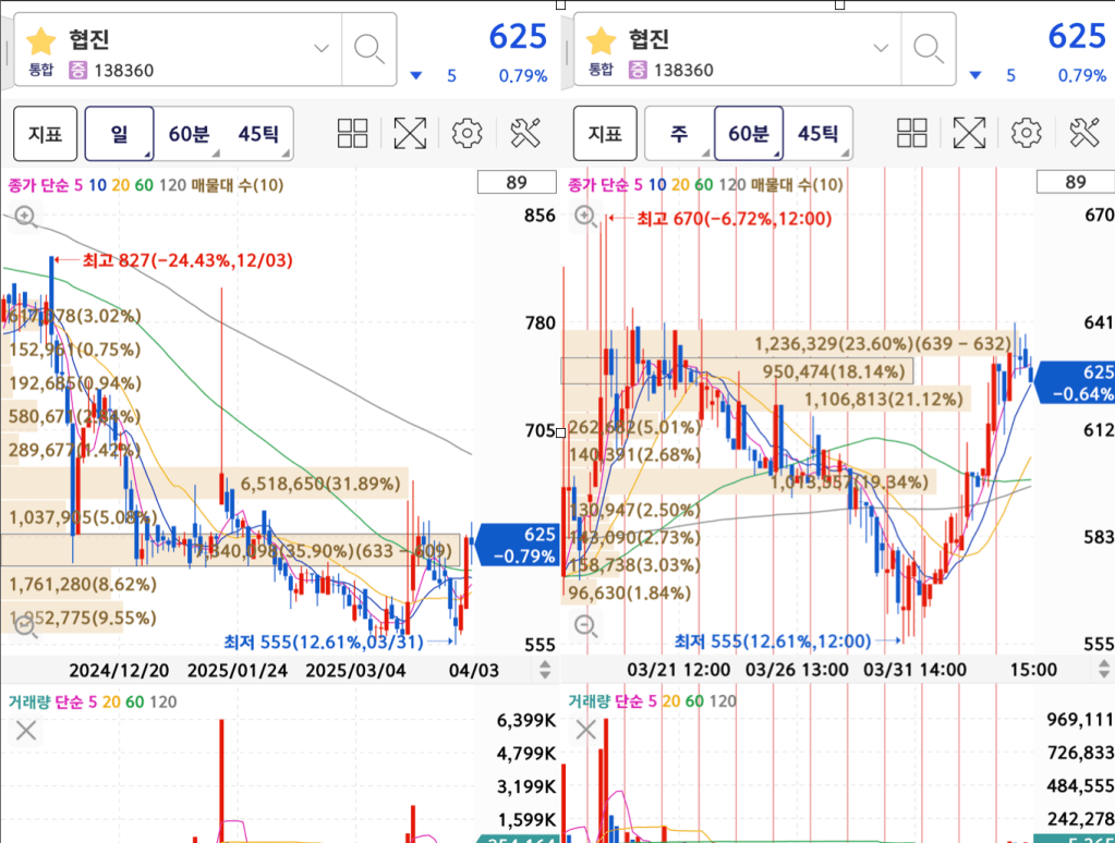 협진의 최근 거래량을 보면 가장 많이 터진 거래량이 600만주 가량이고 평소에 100만주를 넘기는 경우가 거의 없다.