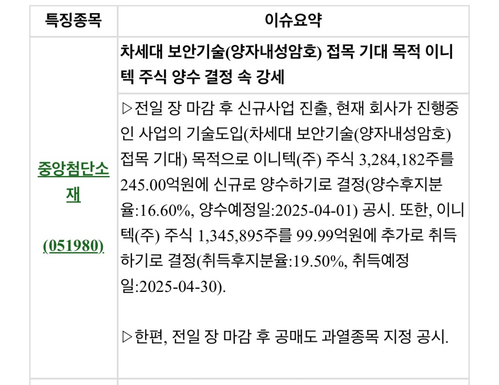 중앙첨단소재의 재료를 살펴보니 이니텍이란 기업의 최대주주가 될 예정이다.