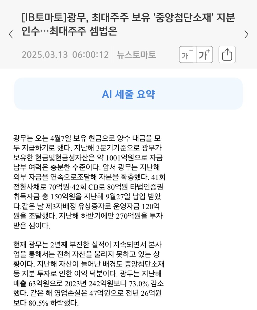 특이사항은 중앙첨단소재의 기존 최대주주가 광무의 기존 최대주주와 동일하다는 점이다.