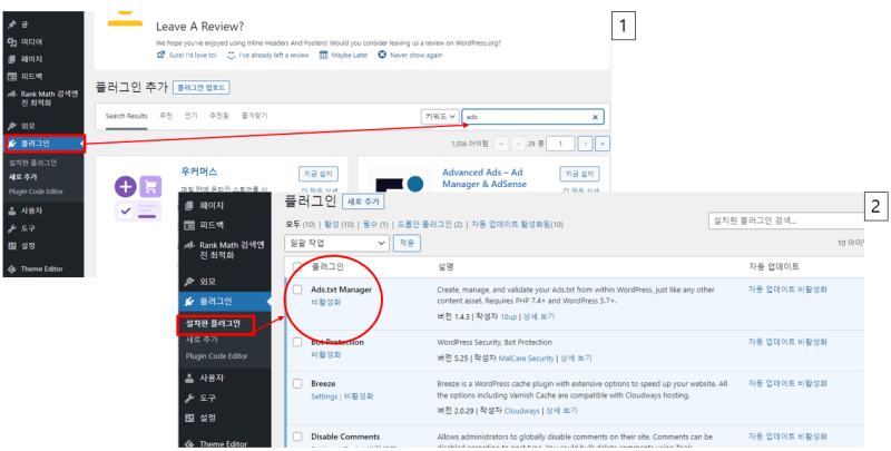 워드프레스 관리자 모드 좌측 메뉴 중 플러그 인에서 ads.txt Manager를 설치합니다.
