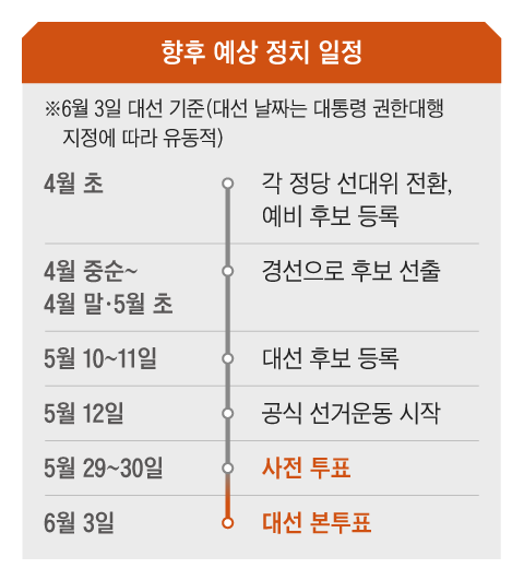 6월 3일에 대선이 치러진다면 정식 후보자 등록일은 선거일 24일 전인 5월 10일부터 11일까지 이틀간이며, 후보자 등록 마감 이튿날인 12일부터 선거일 하루 전인 6월 2일까지가 공식 선거운동 기간으로 지정된다. 대선에 출마할 현직 광역자치단체장들은 선거일 30일 전 사퇴해야 하기 때문에, 6·3 대선이 치러질 경우 광역단체장들은 다음 달 4일까지 거취를 결정해야 한다.