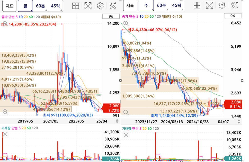 차트가 바닥이기 때문일수도 있지만 중간중간 급등 시 찍은 최고 거래량도 800만, 500만, 300만주 가량밖에 안되고