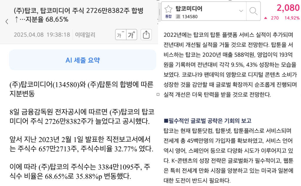 탑코미디어는 웹툰 유통 영업이 주 사업이고 국내에서 꽤 인지도 있는 웹툰인 탑툰이라는 자회사와 얼마 전 합병을 했다.