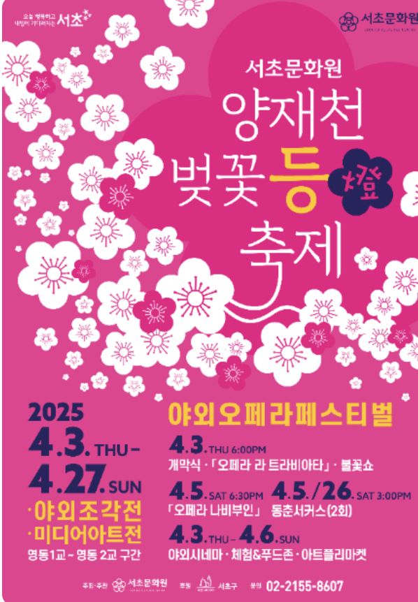 - 내용: 매주 주말, 양재천 벚꽃과 함께 즐기는 다채로운 버스킹 공연
