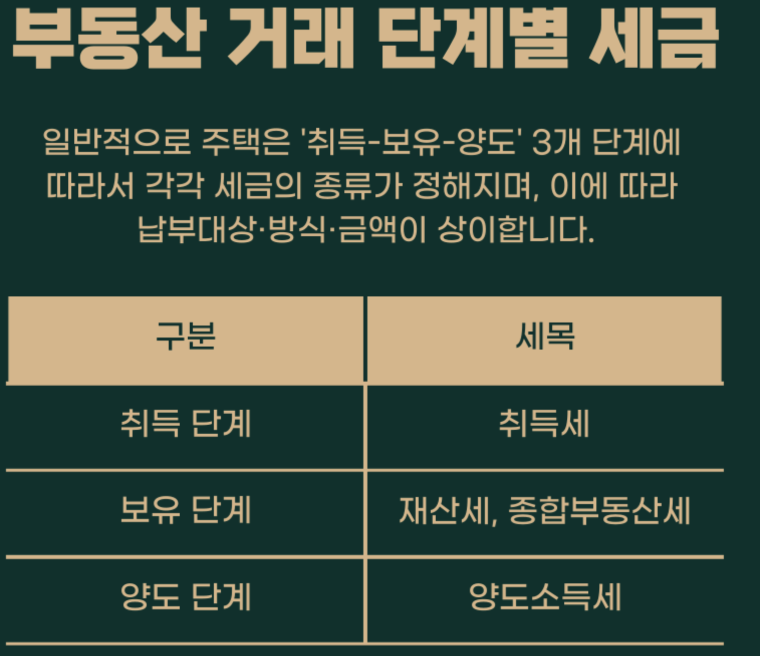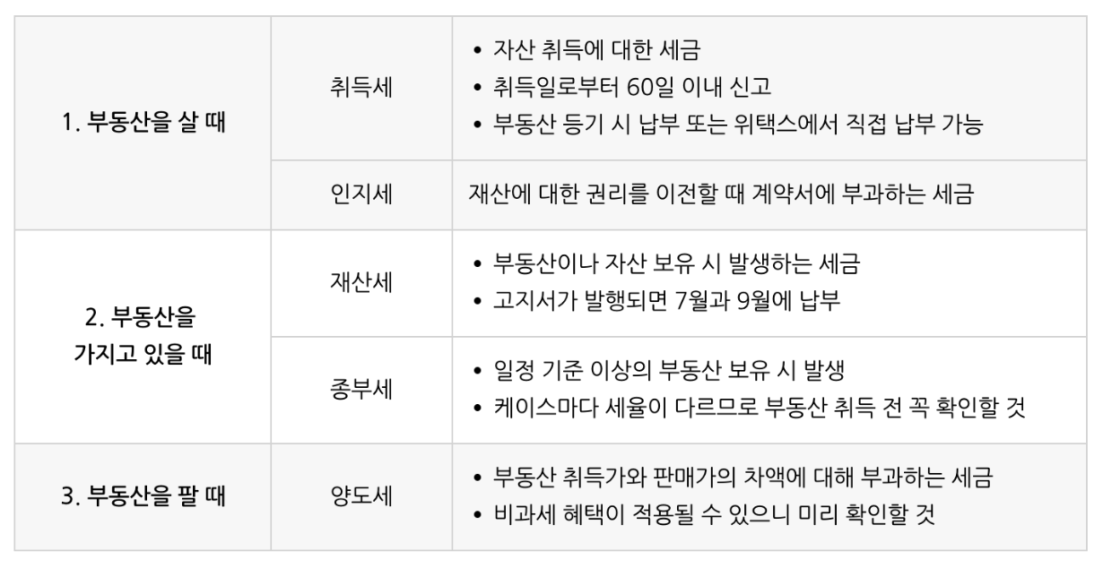 - 부동산 세금은 살 때, 가지고 있을 때, 팔 때 발생합니다.