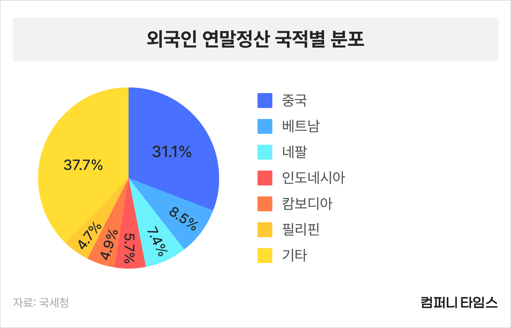 마지막으로 국내에서 근로하며 소득을 신고한 외국인 급여도 한눈에 살펴볼 수 있었는데요. 2023년 귀속 외국인 근로자의 연말정산 신고 인원은 약 61만명으로, 평균연봉은 3278만원이었습니다. 국적별 신고인원 비율을 살펴보면 중국(31.1%), 베트남(8.5%), 네팔(7.4%) 순으로 많았습니다.