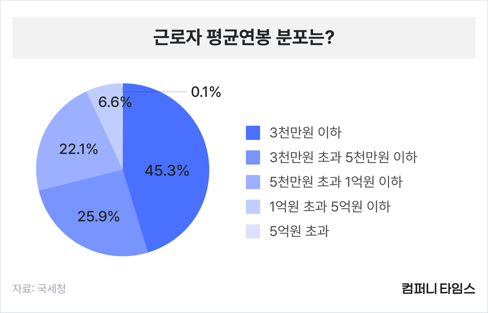 연봉 1억이 넘는 근로자 수는 전체 2085만명 중 139만명으로 6.7%를 차지했습니다. 억대 연봉자의 점유율은 매년 계속 늘어나고 있는데요. 2022년 점유율 6.4%(132만명)와 비교할 때 0.3% 증가한 것으로 나타났어요.