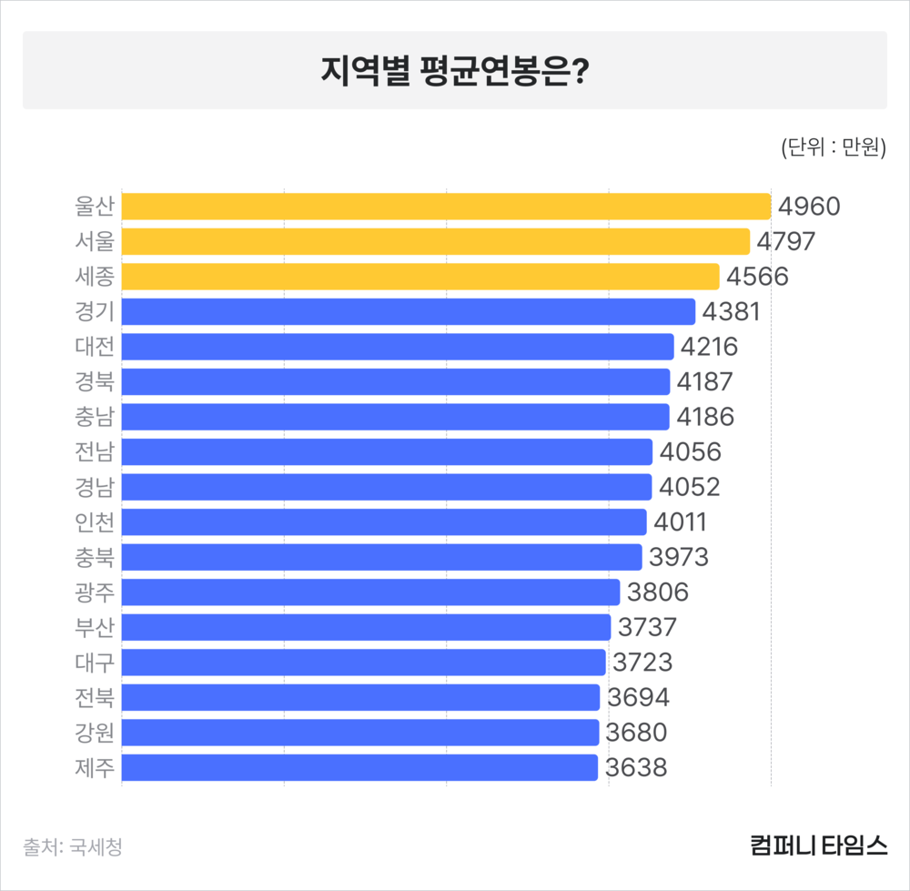 “2023년 직장인 평균연봉은 4332만원, 평균연봉이 가장 높은 지역은 울산광역시.”