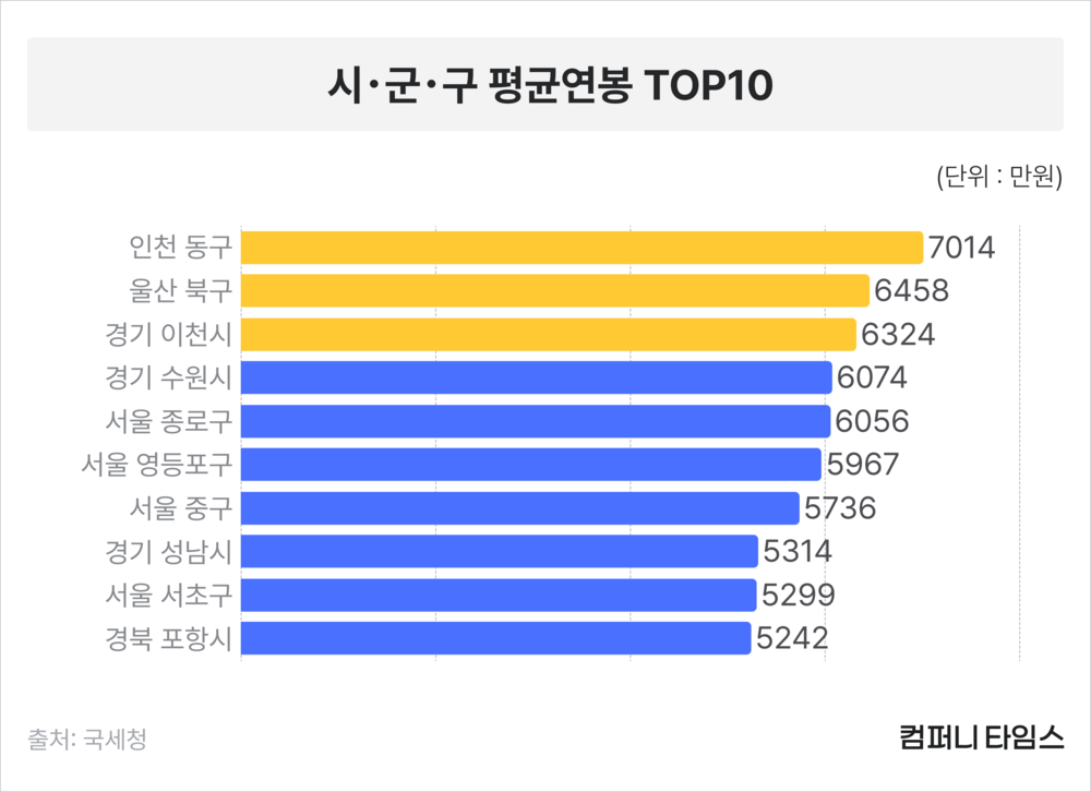 시·군·구 단위로도 평균연봉이 집계됐는데요. 지역구로 범위를 좁혀 살펴 보면 평균연봉 1위를 차지한 곳은 울산, 서울, 세종이 아닌 인천 동구였습니다. 7014만원으로 전체 근로자 평균연봉인 4332만원을 큰 격차로 웃돌았습니다. 이어 울산 북구, 경기 이천시가 뒤따랐는데요. 모두 평균연봉 6천만원대를 기록했어요.