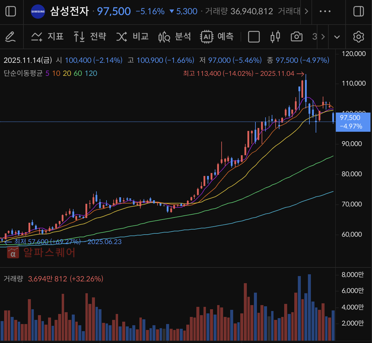 - 당일(14일) 변동: 전일 102,800원 → 97,500원으로 약 –5%대 하락