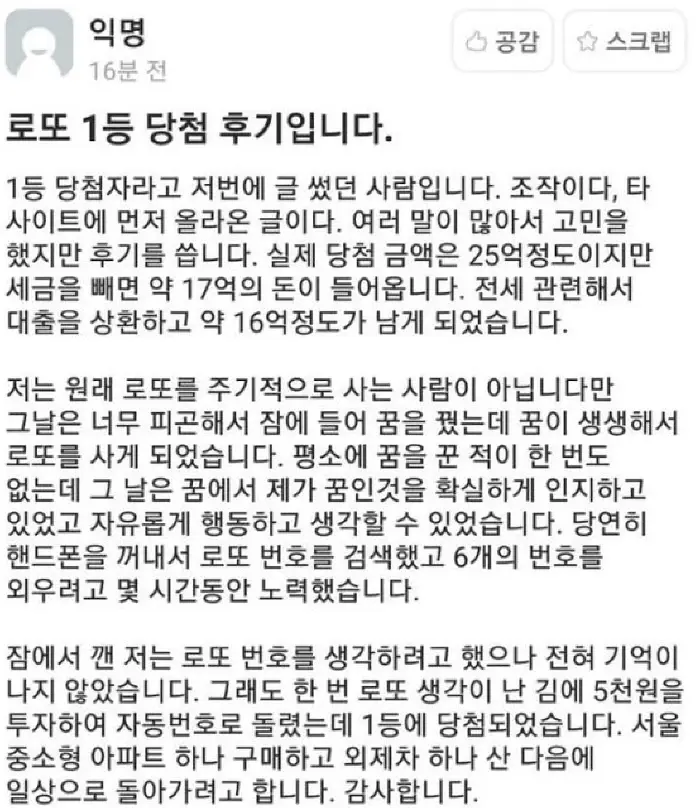 간밤에 꿈에서 조상님 한분이 나와 불러준 숫자대로 구매해서 당첨된 사람이 꽤 많다.