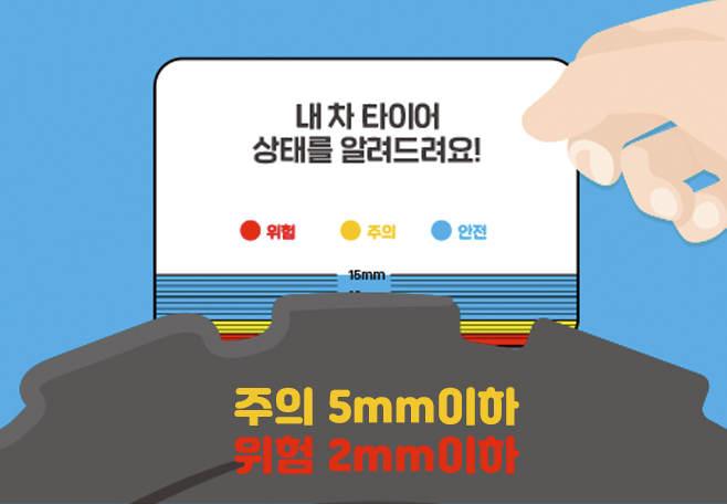 트레드의 높이가 5mm 이하라면 주의가, 2mm 이하라면 타이어 교체가 필요합니다.