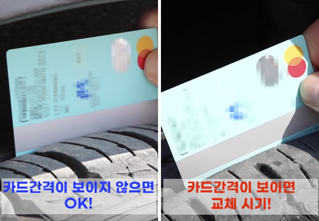 카드 간격이 타이어 트레드 위로 올라온다면 타이어가 3~4mm 정도 밖에 남지 않은 것으로 교체가 필요합니다.