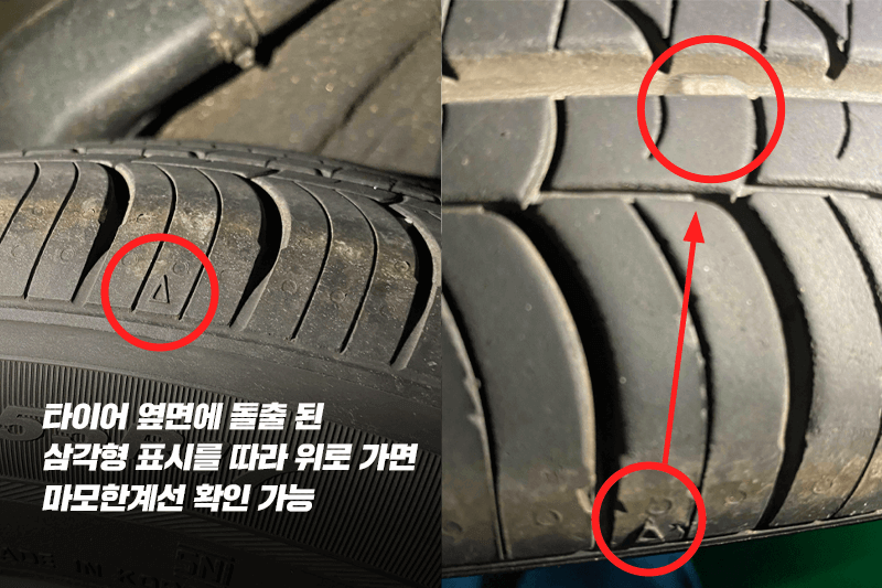 타이어 옆면에는 돌출된 삼각형 모형이 새겨져 있습니다. 그 표시를 따라 위로 가면 '마모한계선'을 확인해 보실 수 있는데요.