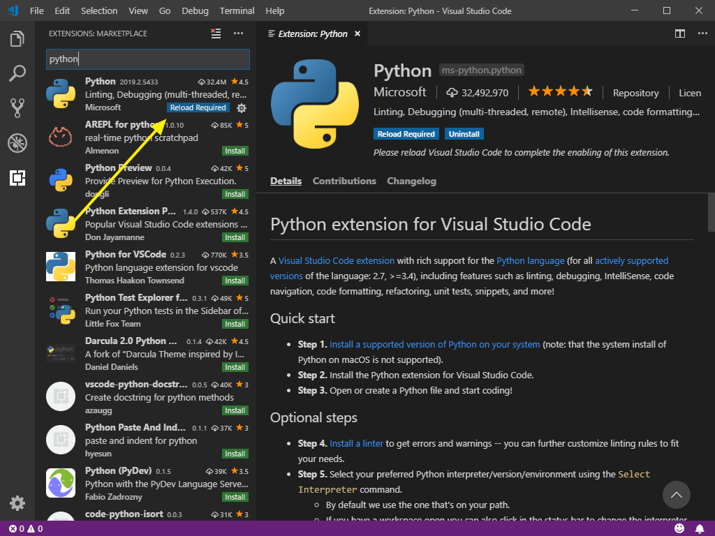 - Reload Required를 클릭합니다.(VS Code 버전에 따라 나오지 않을 수도 있습니다.)