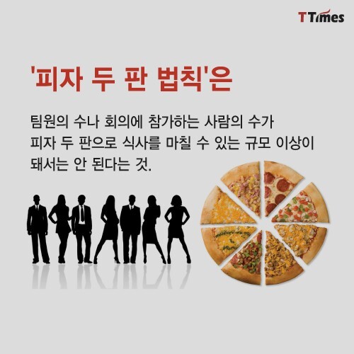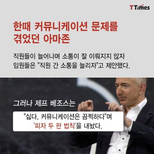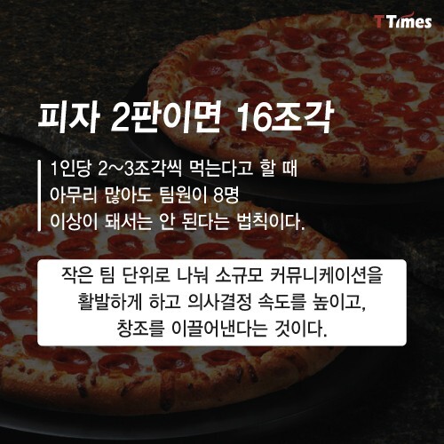 그래서 ‘팀(Team) 빌딩’과 조직운영을 좀 더 효율적으로 하고자 한다면 제프 베조스의 '피자 두 판의 법칙‘을 고려해보자.