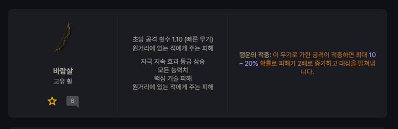 변경 예정 고유 아이템인 바람살의 속성 변경이 진행된다면, '취약 피해' '핵심 기술 피해' '원거리에 있는 적에게 주는 피해' '자극 지속 효과 등급' 4가지 속성과 공격 적중 시 일정 확률(행운의 적중)로 2배의 피해량을 주고 적을 밀쳐내는 고유 효과를 갖게 된다.