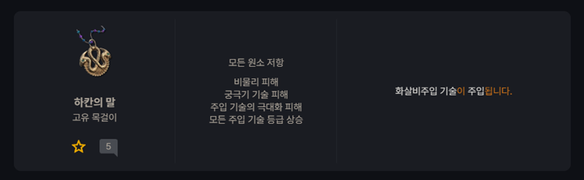 하칸의 말은 패치 이후 '비물리 피해' '재사용 대기 시간 감소' '주입된 기술 피해' '모든 주입 기술 등급'과 화살비에 주입 기술이 주입된다는 고유 효과를 갖게 된다. 앞선 스킬의 화살비 편의성 개편도 이러한 하칸의 말 변경에 맞춰서 원거리 빌드에 힘을 실어주기 위해 함께 진행되는 것으로 보여진다.