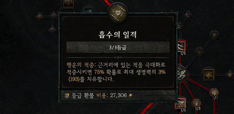 - 변경 전 : (행운의 적중) 근거리에 있는 적을 극대화로 적중시키면 75% 확률로 생명력 회복