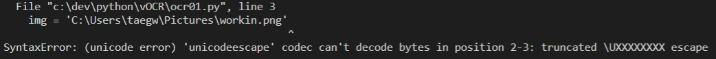 변수에 파일위치는 배치한 부분에서 에러가 발생했다. "SyntaxError: (unicode error) 'unicodeescape' codec can't decode bytes in position 2-3: truncated \UXXXXXXXX escape" "... truncated \UXXXXXXXX..." --> \U 이것때문에 유니코드로 인식되기 때문이다. 해결은 img = 'C:\Users\taegw\Pictures\workin.png' 여기에서 파일명을 표시한 따옴표 앞에 r을 붙여준다. img = r'C:\Users\taegw\Pictures\workin.png' 에러가 발생하지 않았다. 여기서 'r'은 Raw 문자열을 의미하게 하는 것이다. 가공되지 않고 문자 그대로를 사용하라는 뜻이된다..